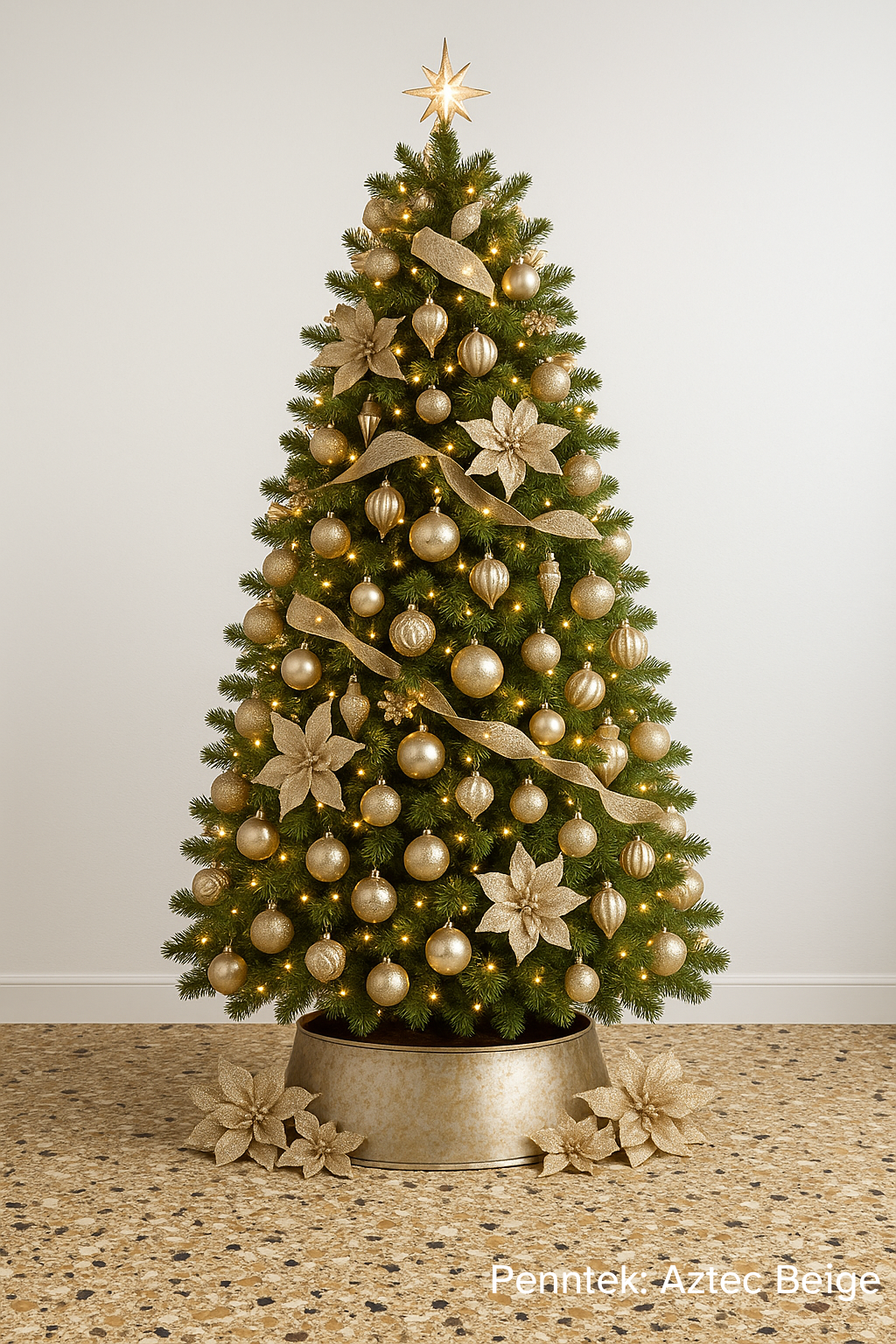 Aztec Beige brings a warm, sophisticated feel that pairs wonderfully with a glamorous tree dripping in metallic ornaments and shimmering ribbon. Champagne tones blend beautifully with the floor, giving your holiday setup a luxe, designer feel. Opt for glittery poinsettias or pearl ornaments to finish the look.