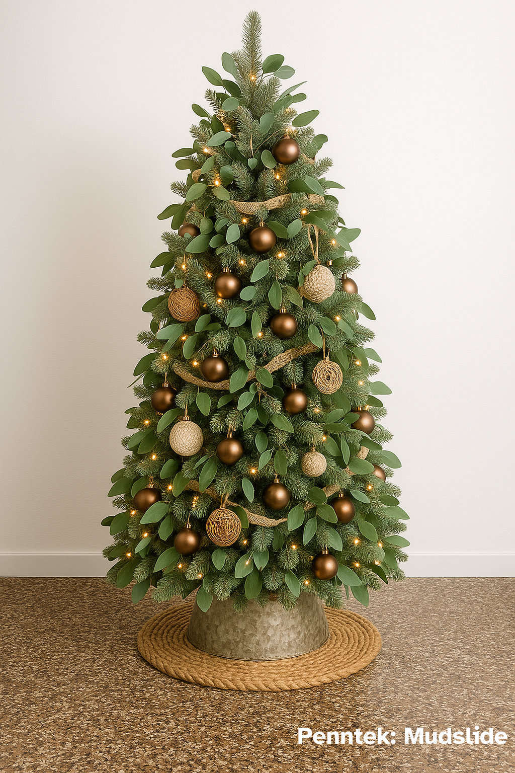 Mudslide's rich tan and chocolate-brown blend creates a warm, grounding base for nature-inspired holiday décor. A tree filled with eucalyptus garlands, bronze ornaments, woven textures, and soft greenery pairs effortlessly with this floor color. The look is earthy, inviting, and perfect for a warm contemporary or boho home.