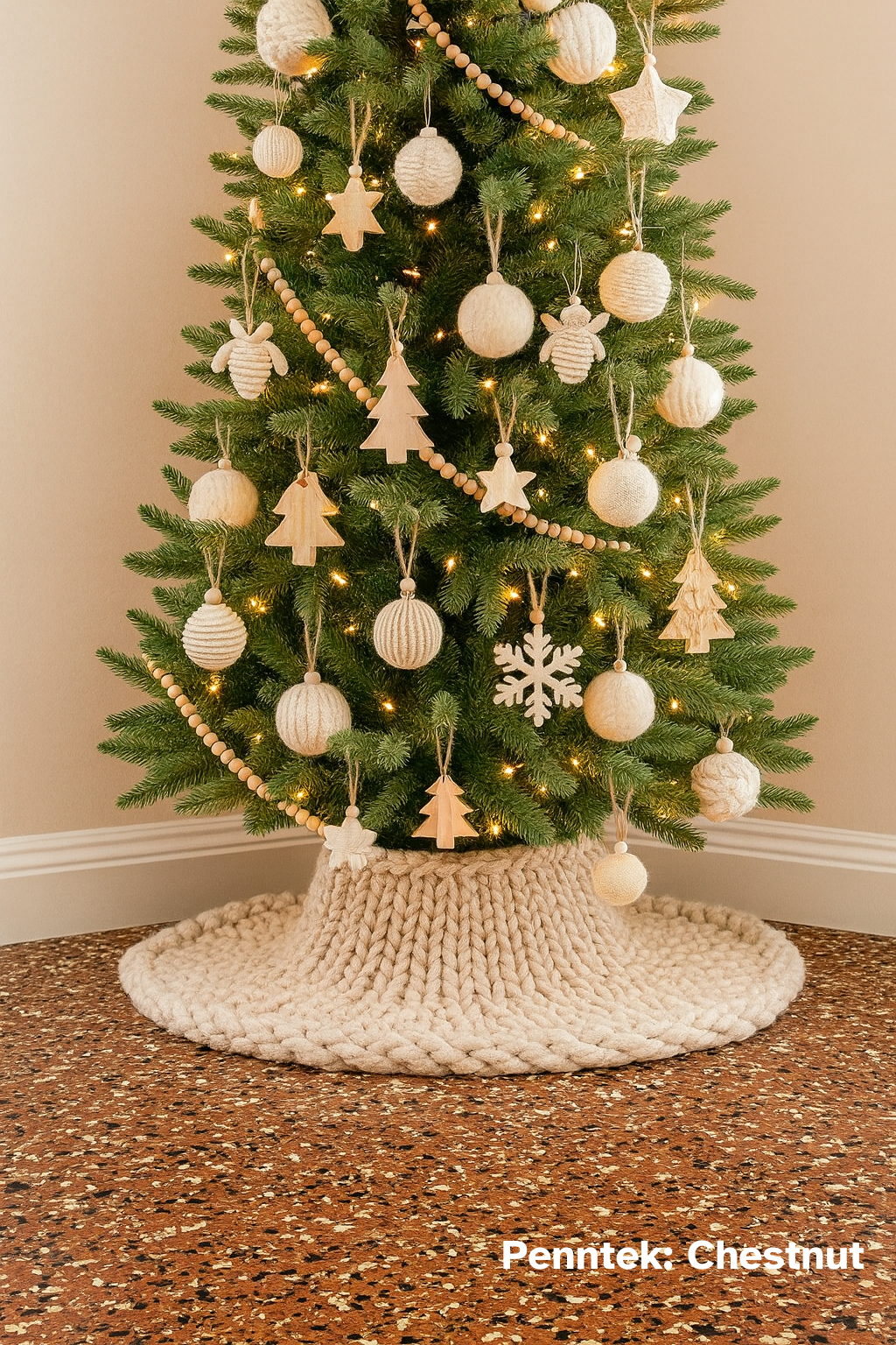 Chestnut's warm browns and subtle earthy variations pair beautifully with a minimalist tree decorated in whites, creams, wood beads, and natural textures. This combo creates an inviting Scandinavian style with a touch of modern coziness. Add a chunky knit tree skirt and soft-glow lights to complete the peaceful holiday aesthetic.