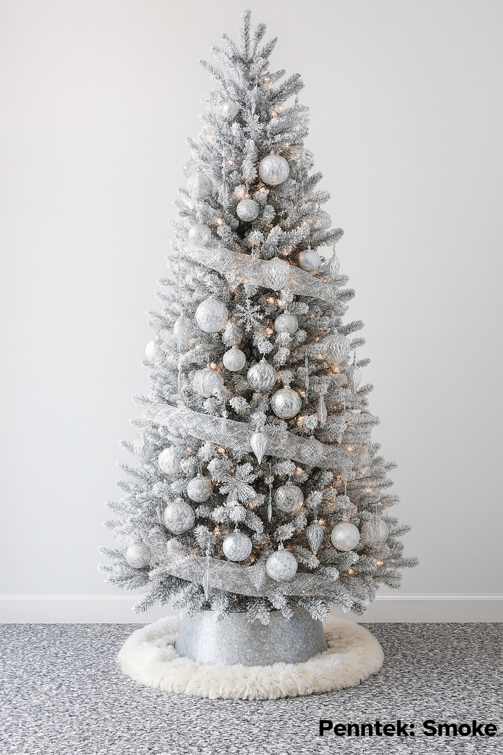 Tree Style: Snow-flocked tree with silver, icy blue, or monochrome décor